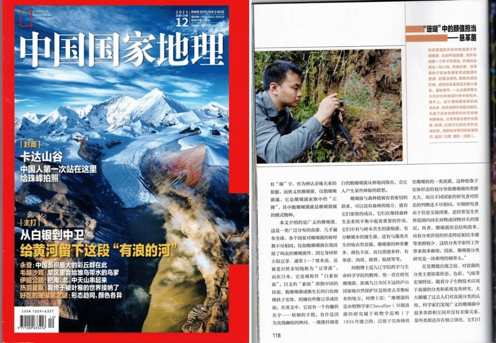 得益于科研团队扎实的前期工作,何刚分别以“庐山国家级自然保护区大型真菌群落多样性格局及其维持机制”和“九岭山国家级自然保护区大型真菌物种多样性分布格局及野生食药用菌种质资源保护”为题获批国家自然科学基金和江西省自然科学基金项目各1项。他参编的《江西大型真菌图鉴》是江西省首部省级菌物资源专著,为阶段性澄清江西省大型真菌资源现状贡献了九江科研力量。2021年12月,他的科研工作获《中国国家地理》杂志专题报道。