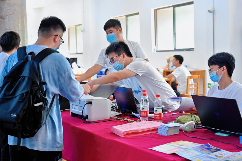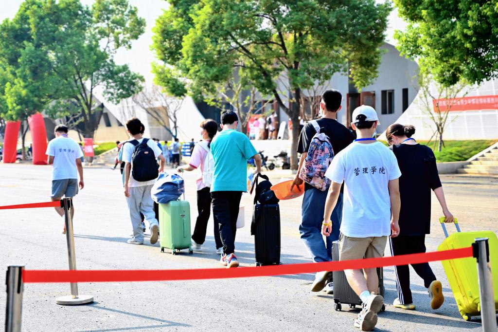 迎新志愿者高高举着所在学院的指示牌引导新同学,热情洋溢的学长学姐介绍着学校的信息。确认入学信息、分班分寝室、领取学生卡……新同学在迎新志愿者们的引导下有序完成开学报到。这些刚刚从天南海北奔赴九院的新生,很快缓解了奔波的疲惫和初入校园的拘谨。