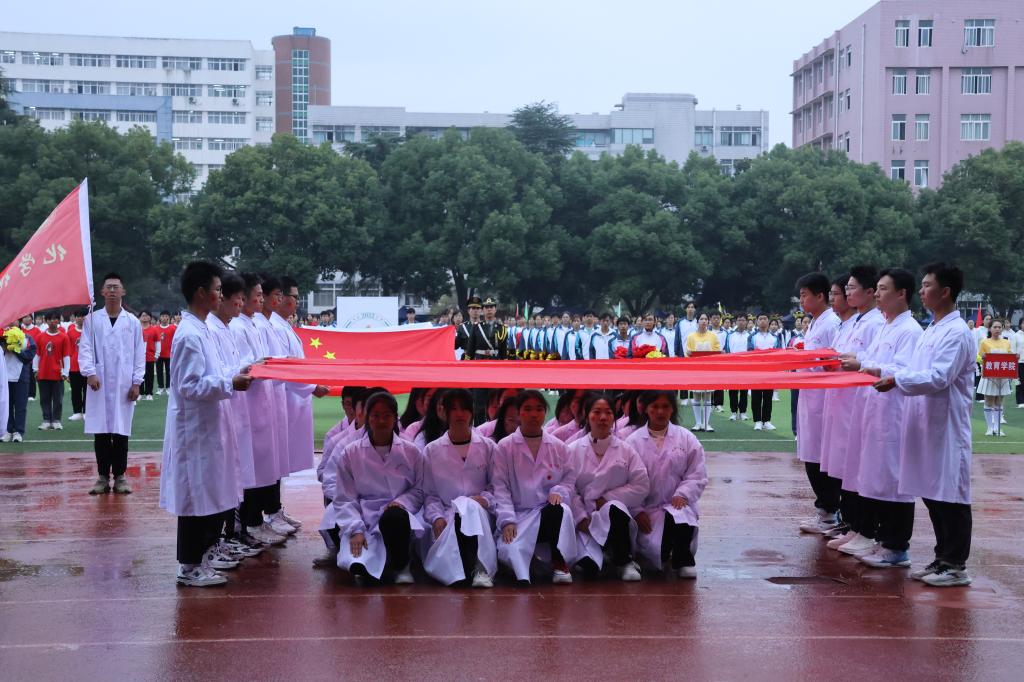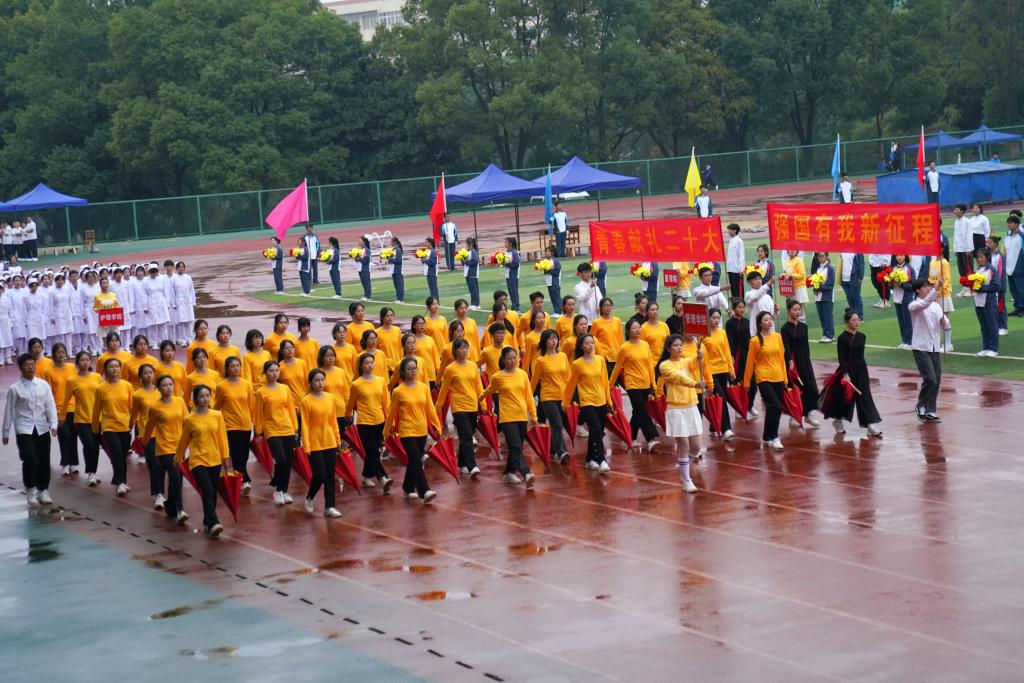 紧接着,鲜花队、彩旗队、裁判员方队和来自各个学院和学校教职工的22个运动员方阵也踏着矫健的步伐依次入场。击鼓表演、汉服舞蹈、纸牌拼字……运动会方阵入场精彩纷呈,各二级学院纷纷结合各自的学院和专业特色,用别出心栽的表演向党的二十大献礼。时尚新潮的音乐、青春曼妙的舞姿、铿锵响亮的口号,让人感受到了青春的活力、创造的激情;昂扬饱满的状态、勃发的英姿和别出心裁的方阵秀让现场的气氛瞬间热烈起来,掌声、欢呼声响彻云霄。