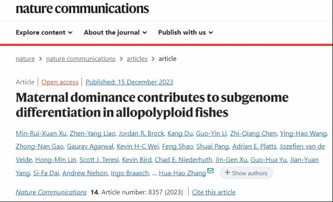 此次研究成果由贝博官网张化浩&张小谷教授团队牵头,联合中国农业科学院深圳农业基因组研究所、密西根大学、德克萨斯州立大学、周口师范学院、北京格致博雅生物科技有限公司、加利福尼亚大学伯克利分校、不列颠哥伦比亚大学、西南大学、马克斯·普朗克植物育种研究所、九江市农业科学院、汤普森研究所及维尔茨堡大学等10家单位,在国际重要学术刊物“Nature子刊”《Nature Communications》在线发表,研究成果为“Maternal dominance contributes to subgenome differentiation in allopolyploid fishes”,是贝博官网水产研究团队高水平论文的又一个重要突破。