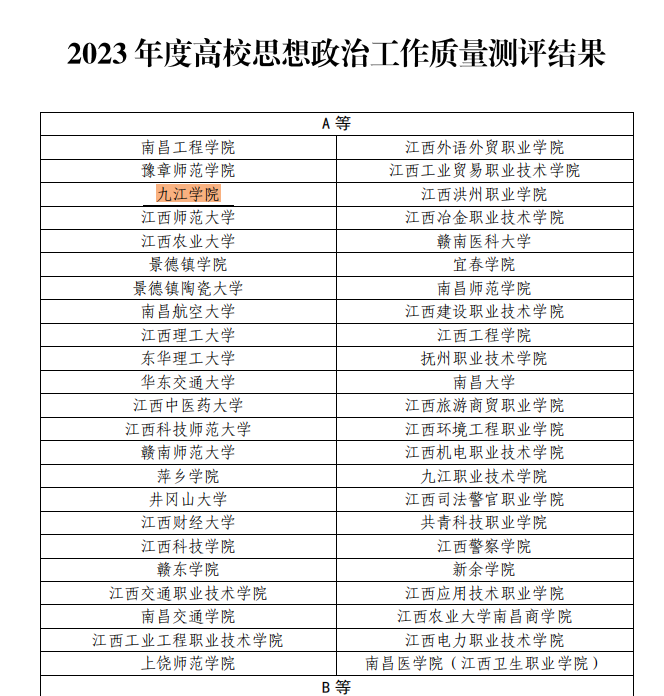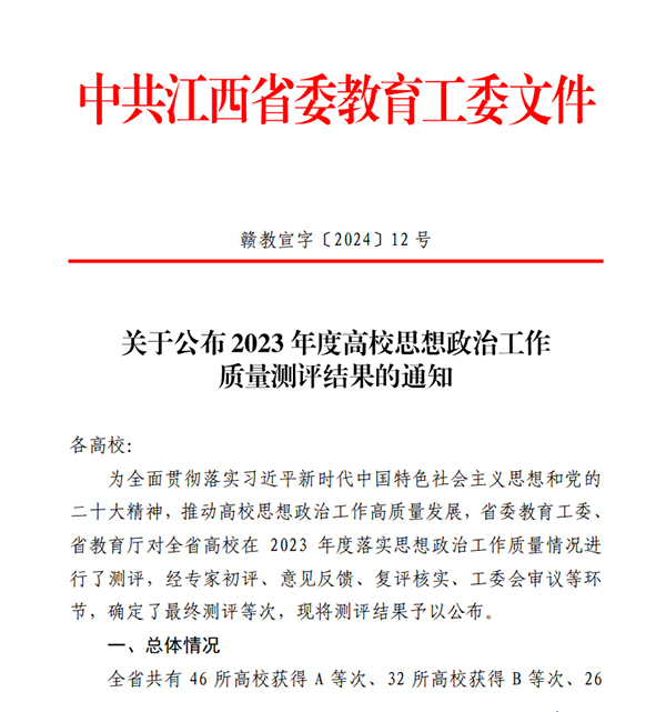 近日,省委教育工委发布《关于公布2023年度高校思想政治工作质量测评结果的通知》,贝博官网再次获评A等,并位居全省本科高校前列。