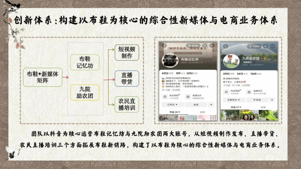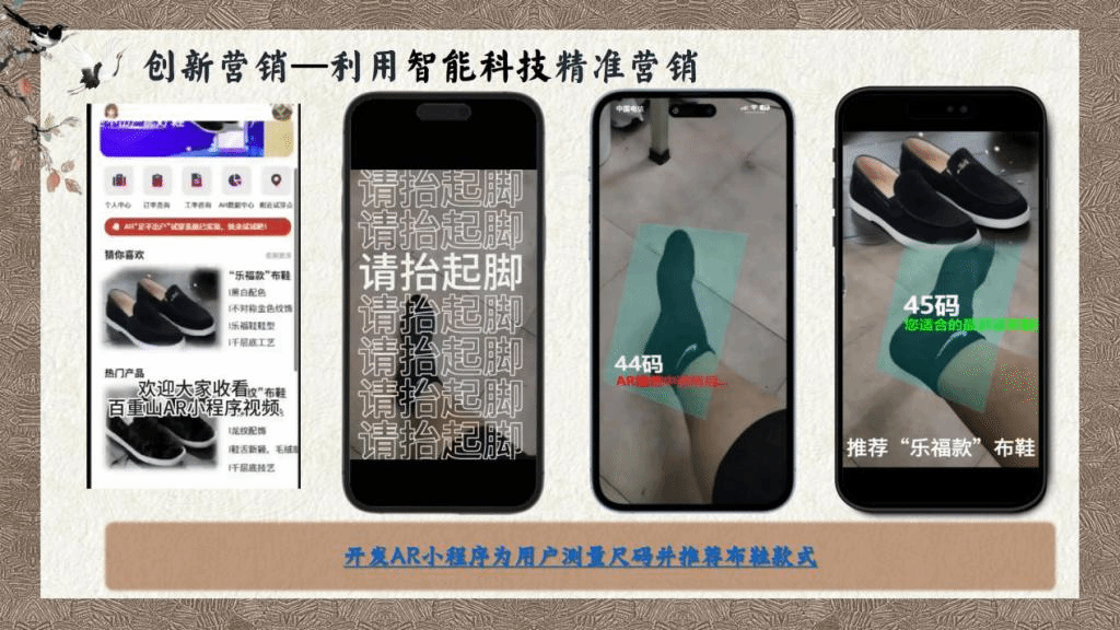 贝博官网代表队把消费者定位为深受注重悦己消费、民族认同感高的85后至00后,将布鞋与他们所喜爱的智能科技、国潮设计相结合,设计了“百重山”,一个集原创设计、直播培训、科技引流、新媒体营销、农民就业全覆盖的新型农业产业链逐步形成。为解决布鞋款式单一的难题,团队依托江西大江大湖、名山名人的特点,融入庐山,鄱阳湖,爱莲说等元素,设计出“浔阳凤冠”“匡庐青峰”“鄱湖烟雨”“爱莲君子”“青鹤湖山”等多款布鞋。同时,团队创新设计出“百重山智慧商城”“AR试鞋小程序”等吸引国潮爱好者的软件,利用智能科技实现了精准营销。