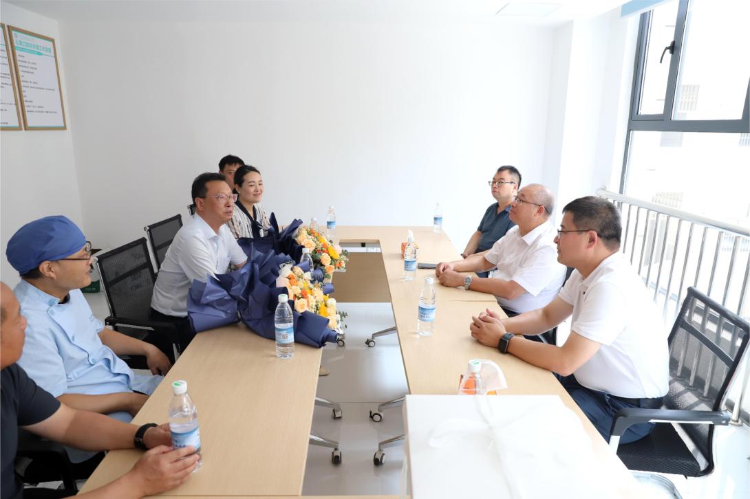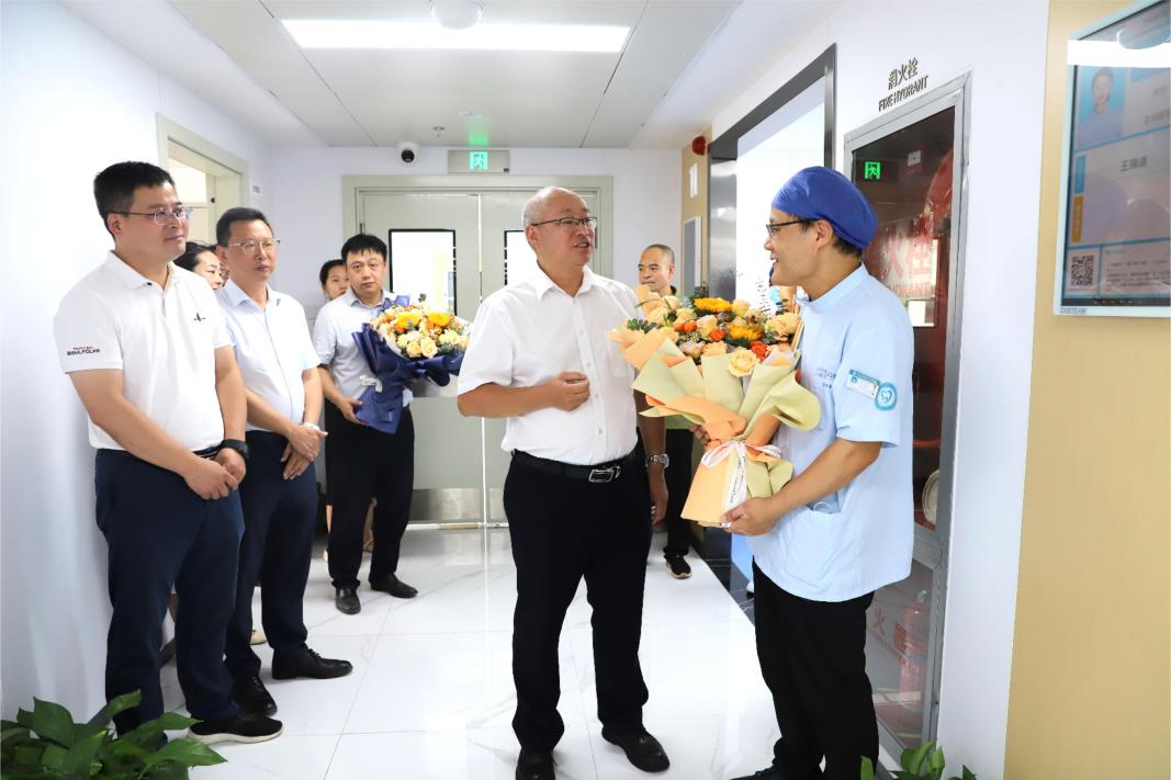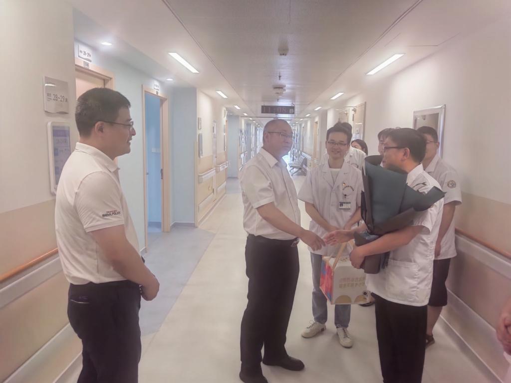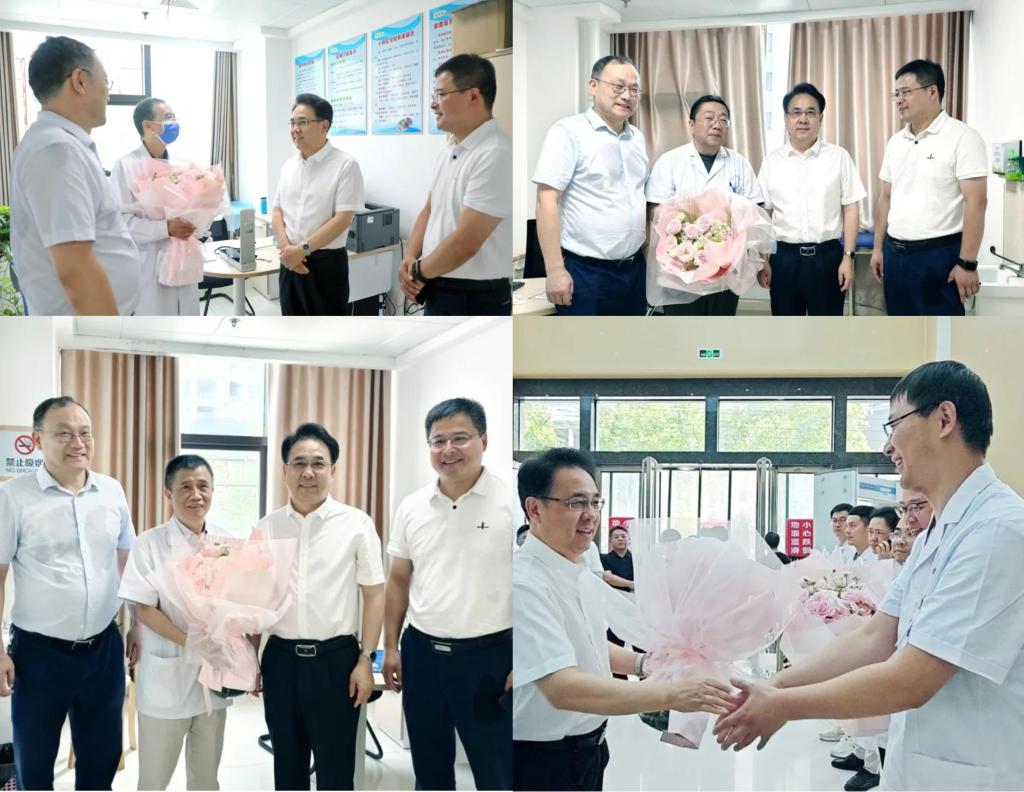 在学校附属医院门诊楼,李明斌、雷志强深入门诊科室等处看望正在开展诊疗工作的专家和医师们,与大家亲切握手、交谈,详细询问他们的工作与生活情况,并致以节日的问候,传递学校党政对一线医务人员的关怀。校领导还为附属医院优秀医师代表送上鲜花,在门诊大楼4楼会议室与医师代表们进行了座谈。座谈中,校领导与医师们亲切交流,听取他们对医院工作的意见建议,以及个人发展上的规划和思考,了解他们在工作生活上的困难和需求,并叮嘱他们在做好医疗科研工作的同时注意劳逸结合。