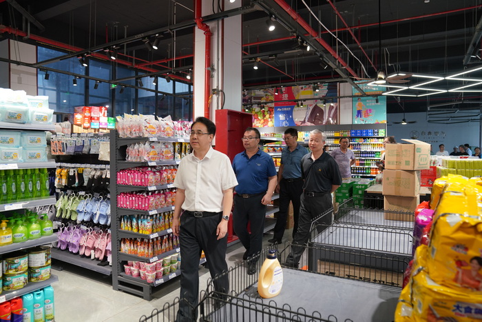 在紫薇园超市,李明斌仔细询问超市是否备足了学生日常所需的生活用品和学习用品。他强调,超市作为校园内的重要服务设施,要充分考虑学生的实际需求,确保商品种类丰富、价格合理、质量可靠,为学生们提供便捷、舒心的购物体验。