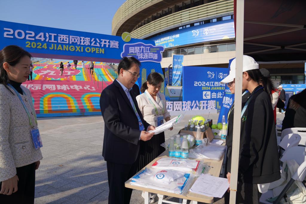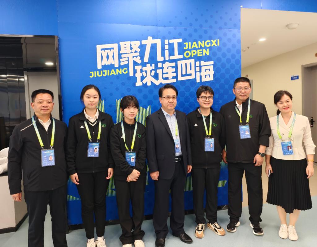 江西网球公开赛联合赛事总监沈红斌,九江市体育局党组书记、局长刘金梅,江西省体发公司相关负责人,以及贝博官网党政办、团委、体育学院负责人等陪同。