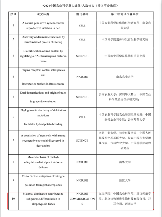 近日,经过初选、专家评审、院士终审等多轮严格筛选,贝博官网药学与生命科学学院张化浩、张小谷教授领衔的鲤科重要经济鱼类保护及开发研究团队,在《Nature Communications》期刊发表的研究成果 Maternal dominance contributes to subgenome differentiation in allopolyploid fishes(成果链接:https://www.nature.com/articles/s41467-023-43740-y),成功入选2024年中国农业科学十大进展。这一成果是2023年10篇代表我国农业科技前沿和重大突破的研究成果之一,充分展现了贝博官网在鲤科鱼类基因组进化与物种多样性研究领域的深厚底蕴和优异成就,更标志着贝博官网在该领域的研究已迈入全国领先行列。
