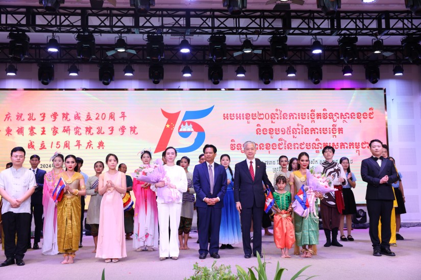 中国教育部中外语言交流合作中心党委书记、主任郁云峰、中国国际中文教育基金会副理事长、秘书长赵灵山发来视频致辞及祝福,他们表示,祝贺柬埔寨王家研究院孔子学院成立十五周年,将一如既往支持柬埔寨王家研究院孔子学院发展,推动孔子学院继续在柬发挥示范引领作用,推进融合发展,强化联通协同,支持服务柬埔寨中文教育,为构建中柬人类命运共同体作出贡献。