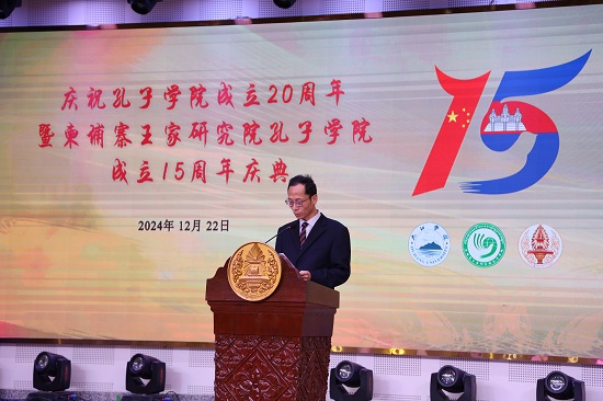 12月22日,柬埔寨王家研究院孔子学院在王家研究院高棉学者厅举办孔子学院成立20周年暨柬埔寨王家研究院孔子学院15周年庆典。中华人民共和国驻柬埔寨王国特命全权大使汪文斌、柬埔寨王家研究院院长宋独(SOK Touch)、BB贝博艾弗森官方网站副校长王殿元出席庆典活动并致辞。中国教育部中外语言交流合作中心代表团、BB贝博艾弗森官方网站代表团、孔子学院师生代表和媒体代表等500余人参与了此次庆典活动。