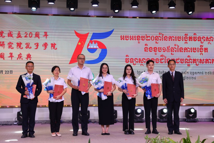 中柬领导向孔子学院的优秀志愿者、公派教师、中方院长以及港澳侨商总会颁发了感谢状。