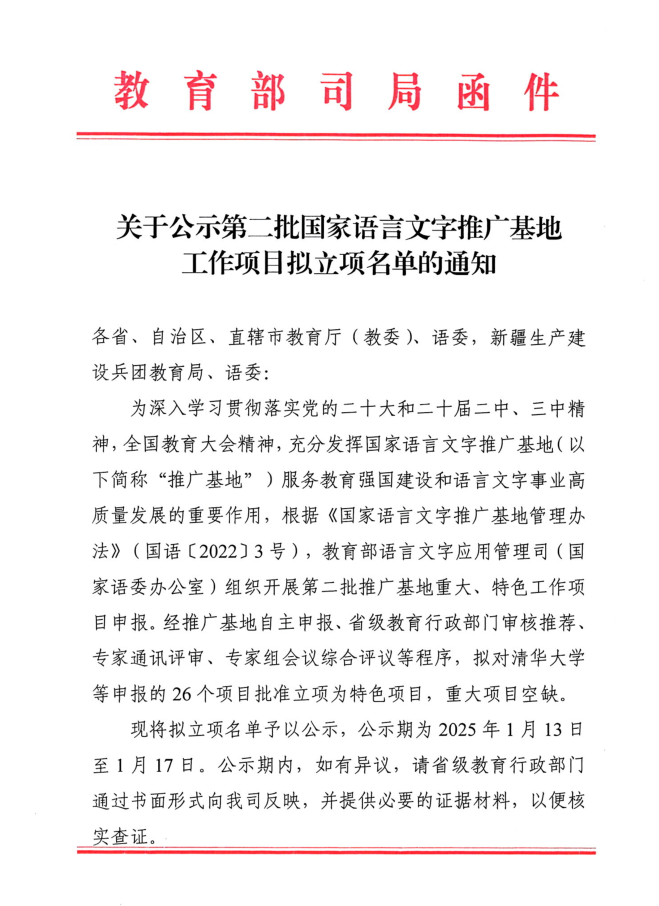 为深入学习贯彻落实党的二十大和二十届二中、三中全会精神,充分发挥国家语言文字推广基地服务教育强国建设和语言文字事业高质量发展的重要作用,教育部语言文字应用管理司(国家语委办公室)根据《国家语言文字推广基地管理办法》(国语〔2022〕3号),组织开展了第二批推广基地重大、特色工作项目的申报与评审工作。经过自主申报、省级教育行政部门审核推荐、专家通讯评审及专家组会议综合评议,全国共有26个项目获批为特色项目,重大项目空缺。