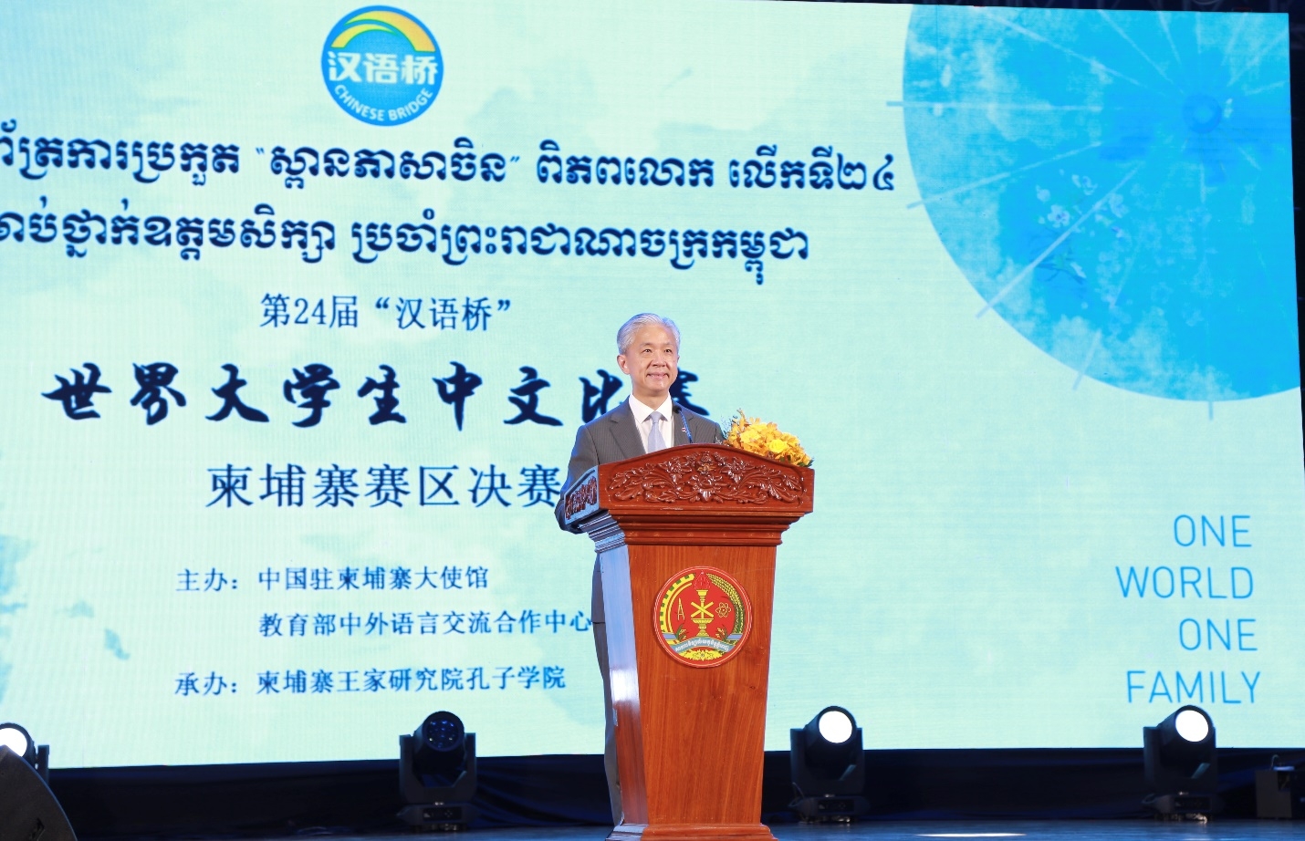中国驻柬埔寨大使汪文斌,柬埔寨副首相兼教育、青年与体育部大臣韩春那洛出席大赛并致辞。汪大使强调,本届赛事是4月17日至18日习近平主席历史性访柬后首场国家级中文赛事,象征着中柬新时代命运共同体建设的新开端,激发了柬埔寨社会新一轮“中文热”。韩春那洛高度评价比赛在推动中文教育、增进青年交流、培养新生代力量和传承两国友谊中的重要作用。