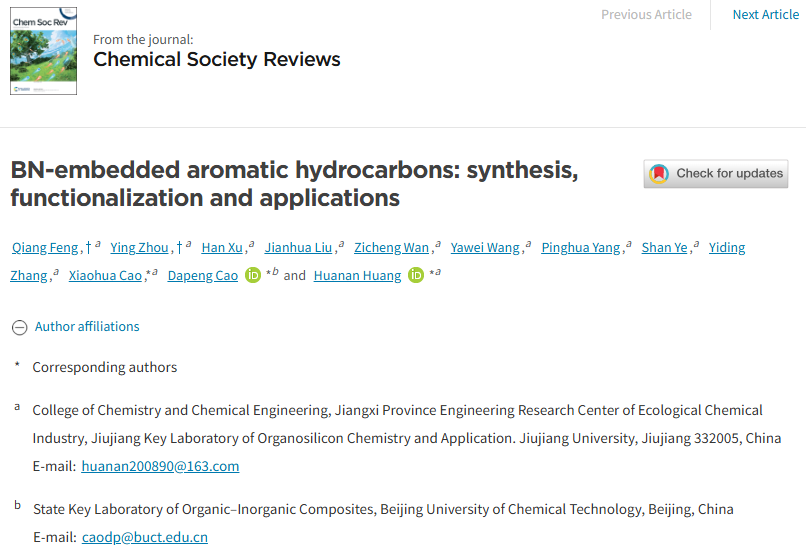 近日,贝博官网化学化工学院有机智能材料创新团队在硼氮有机功能分子构筑及应用研究领域取得突破进展,相关成果“BN-Embedded Aromatic Hydrocarbons: Synthesis, Functionalization and Applications”发表于国际顶级期刊《Chemical Society Reviews》(《化学会评论》)上。这是贝博官网首次以第一完成单位在《Chemical Society Reviews》发表学术论文。化学化工学院冯强博士为该论文第一作者,黄华南教授、曹小华教授为通讯作者,北京化工大学曹达鹏教授为共同通讯作者。