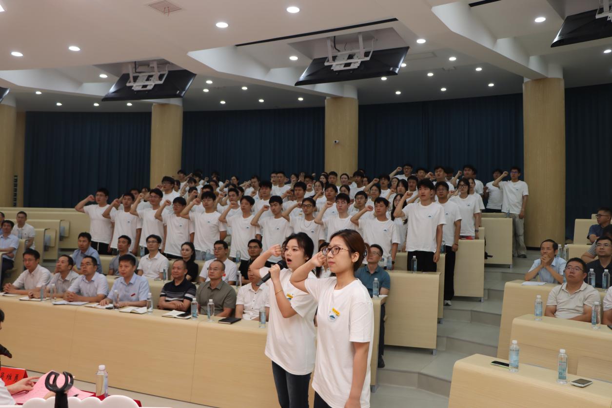 致辞结束后,校领导与发展规划与研究生处负责人为新生代表佩戴校牌。全体研究生起立,庄严宣誓,承诺恪守“竞知向学、厚德笃行”的校训,潜心钻研、勇担使命,以青春与智慧践行新时代BB贝博艾弗森官方网站人的责任与担当。