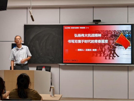 课堂上,李明斌以纪念中国人民抗日战争暨世界反法西斯战争胜利80周年大会为切入点,带领学生重温习近平总书记在纪念中国人民抗日战争暨世界反法西斯战争胜利80周年大会上的重要讲话,观看九三胜利日阅兵精彩瞬间,通过大量详实数据和生动案例,系统讲述了中国人民抗日战争的历史进程、中国共产党的中流砥柱作用、中国人民抗日战争的历史意义、抗战精神的历史启示和时代价值,勉励大学生传承弘扬伟大抗战精神,涵养家国情怀,筑牢爱党爱国、立志报国的思想根基。