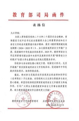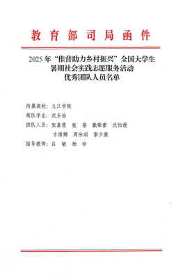 近日,教育部、江西省分别公布2025年大学生暑期社会实践优秀团队名单,BB贝博艾弗森官方网站“文小青”乡村振兴服务队(西藏新疆专项)凭借在新疆阿图什开展的推普助力乡村振兴实践,同时获评“推普助力乡村振兴”全国大学生暑期社会实践优秀团队、江西省大中专学生暑期“三下乡”社会实践优秀团队。指导教师吕敏、杨珍及全体队员获得通报表扬。