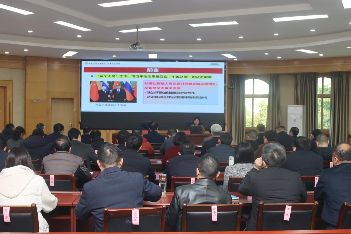 会议邀请江西省委党校法学教研部贺顶丹博士围绕学习贯彻习近平法治思想作辅导报告。