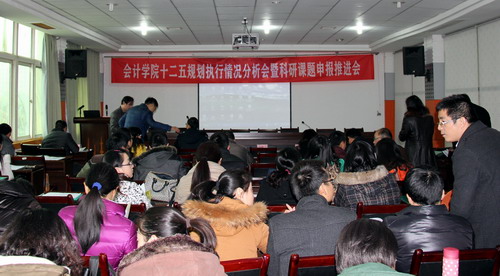 1月14日,会计学院召开“十二五”规划执行情况分析会暨科研课题申报推进会。教务处长马明亮,科研处长王侃民,学位办、学科建设办主任王殿元应邀到会。会计学院院长陈小林、副院长蔡报纯、党委副书记罗维以及全院教职工参加了会议。会议由会计学院副院长张国伟主持。