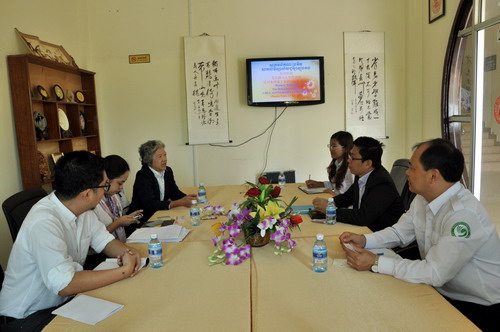 Watcharin Yongsiri女士十分关心在柬汉语教师志愿者赴任前后的培训及在柬工作、生活情况。谢莫尼勒介绍说:汉语志愿者教师赴任前均参加过相关的专业培训,在柬工作期间孔子学院还为志愿者安排专业教师教授柬语及柬埔寨的历史和文化,此举在加强中柬文化交流的同时也丰富了志愿者教师的生活。