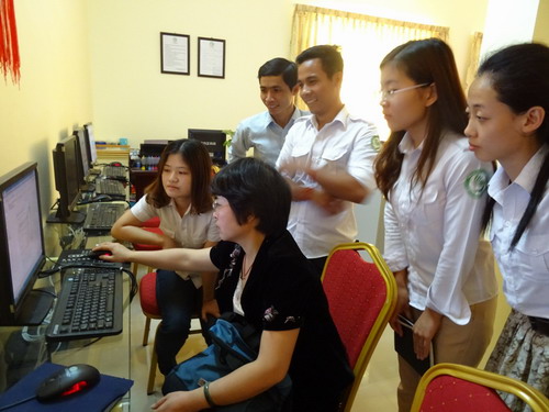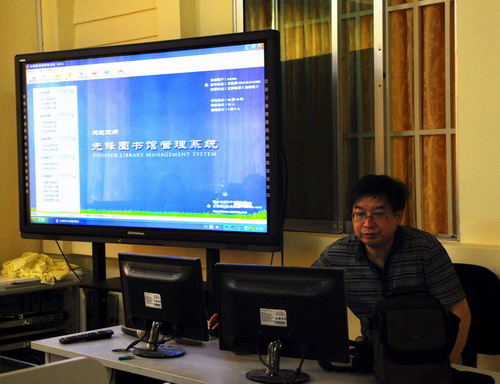 陈先平介绍向汉语教师志愿者介绍图书馆管理系统的使用