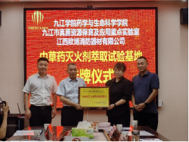 7月5日上午,药学与生命科学学院与江西欧博消防器材有限公司在都昌县都昌镇人民政府举行了“中草药灭火剂萃取试验基地”揭牌仪式。此次校企合作实验基地揭牌,是学校多年来致力于服务九江经济发展和产业提升的又一重要例证。