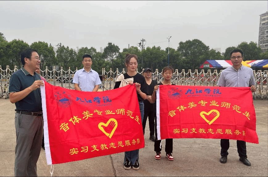 出征仪式上,艺术学院和体育学院负责人分别为支教实习生授旗。