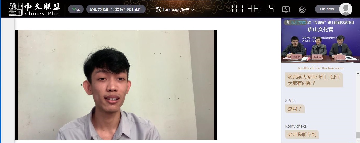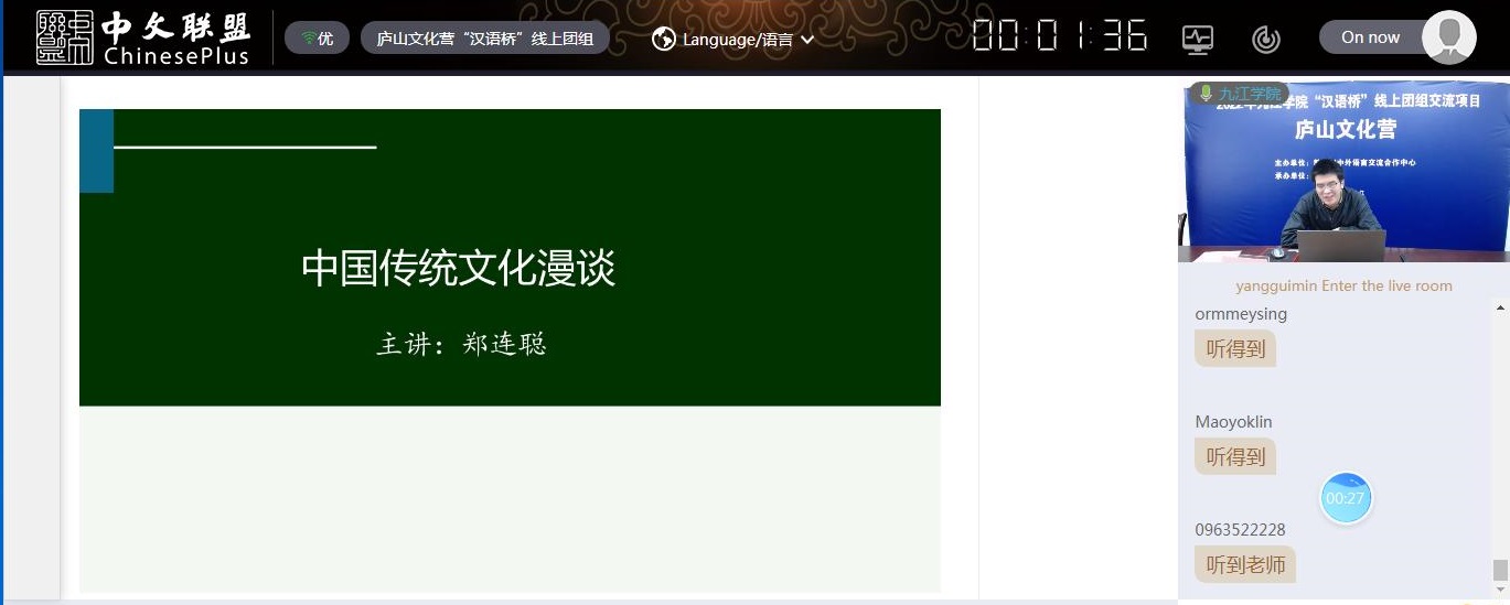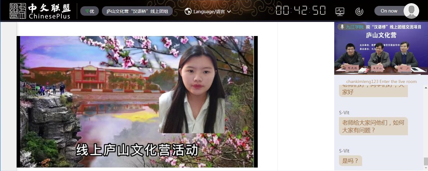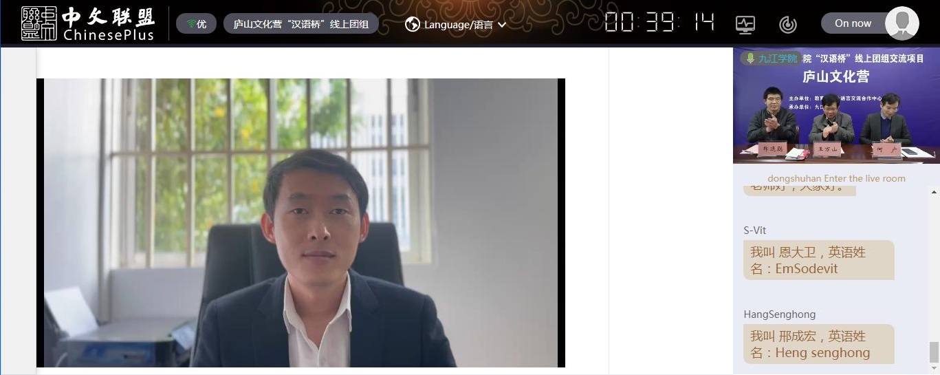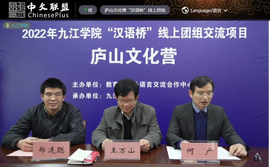 王万山代表学校对2022年“汉语桥”团组交流项目——庐山文化营的顺利开营表示祝贺。他表示,虽远隔千里,但“汉语桥”线上交流项目可以让更多师生了解中国、了解中文、了解中华文化。此次文化营以庐山文化知识为主题,内容涵盖文化类和语言类两部分,以线上直播和视频课程的形式,拓展学生对中国文化和江西省情、九江市情的认知,提高海外学习者了解中国及中国文化的积极性,让学员在快乐中学习中国语言与文化,感受当代中国的社会和经济发展,实现语言学习和文化体验的双丰收。