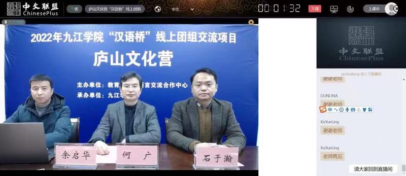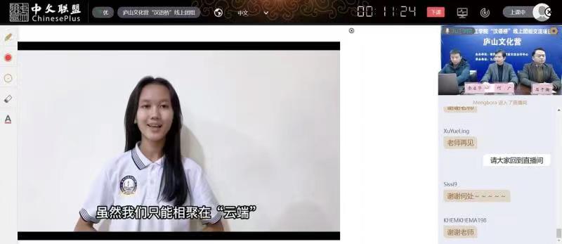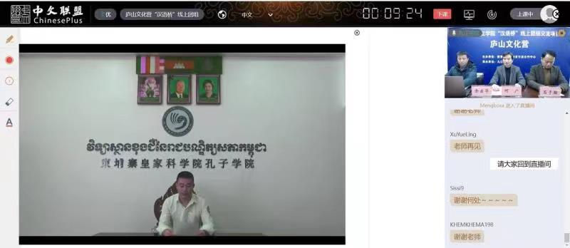 12月16日下午,由教育部中外语言交流合作中心主办,BB贝博艾弗森官方网站承办的BB贝博艾弗森官方网站2022年“汉语桥”线上交流项目——庐山文化营闭营仪式顺利举行。学校国际合作交流处负责人、柬埔寨皇家科学院孔子学院中方院长以及来自柬埔寨、缅甸和泰国的100多位营员相聚云端,共同见证了此次活动的完美收官。