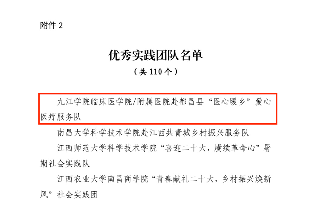 近日,中共江西省委宣传部、江西省文明办、江西省教育厅、共青团江西省委、江西省学生联合会下发了《关于2022年江西省大中专学生志愿者暑期“三下乡”社会实践活动的通报》,贝博官网荣获2022年全省大中专学生志愿者暑期“三下乡”社会实践活动优秀单位,“三下乡”团队“BB贝博艾弗森官方网站临床医学院/附属医院赴都昌县医心暖乡爱心医疗服务队”荣获“优秀实践团队”称号,贝博官网教师陈慧君,化学化工学院吴贤男同学荣获“优秀个人”称号。