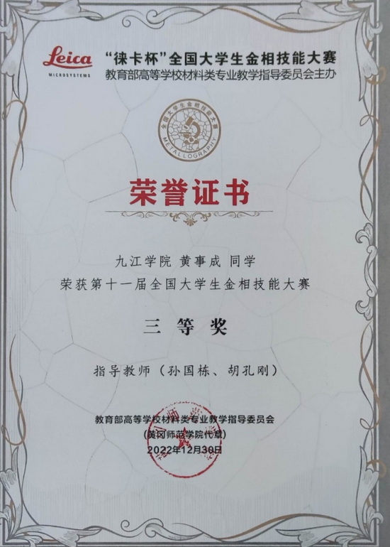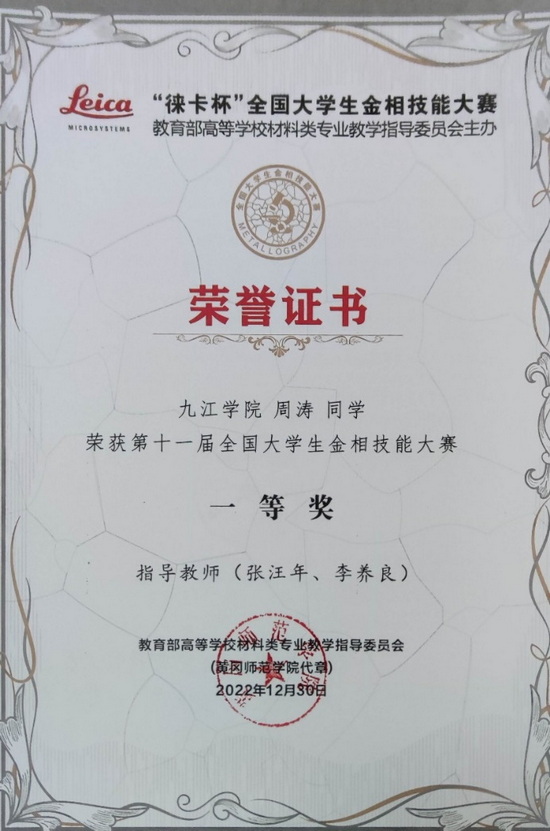 近日,由教育部高等学校材料类专业教学指导委员会主办、黄冈师范学院承办的第十一届全国大学生金相技能大赛落幕,共有来自清华大学、吉林大学、四川大学、武汉大学等414所高校的3700余名在校大学生参加了复赛和决赛阶段的比赛。贝博官网材料科学与工程学院周涛同学荣获个人一等奖,余里泽同学荣获个人二等奖,叶德洲、黄事成同学荣获个人三等奖。