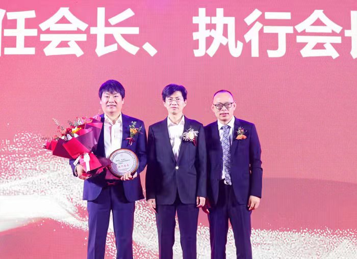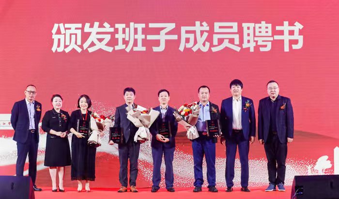 查振华为新任会长柯长文(右一)、执行会长赵文(左一)颁发聘书。
