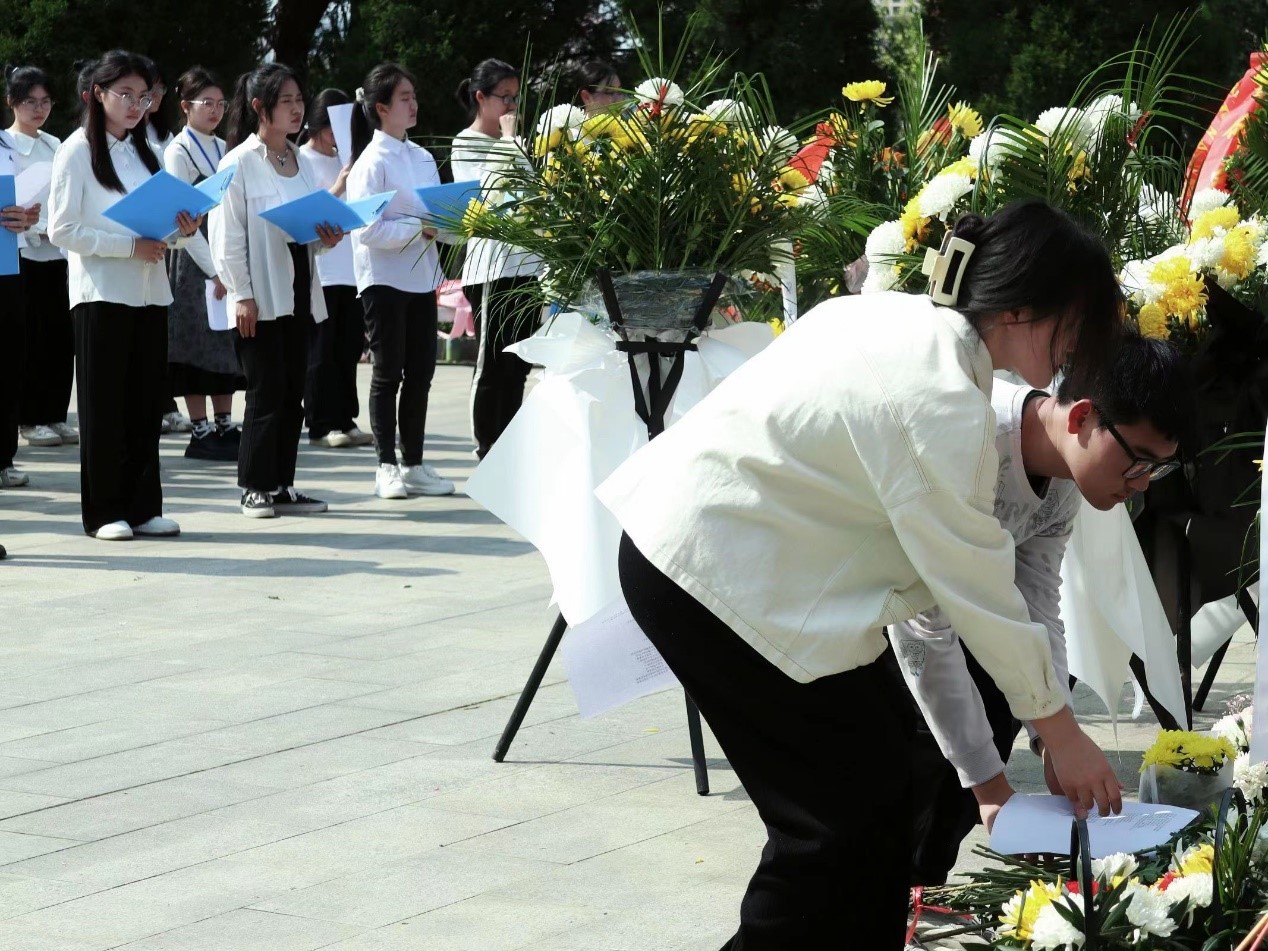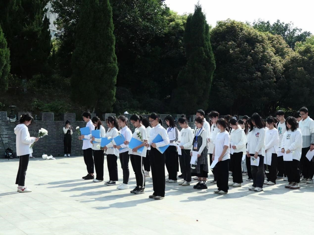 下午2时许,同学们到达南山公园,徒步登山来到肃穆的烈士陵园纪念碑前。全体人员肃穆而立,鞠躬默哀,表达崇高敬意与深切缅怀。一分钟默哀过后,同学们有序上前,为革命先烈献上一朵朵洁白的菊花,寄托哀思。