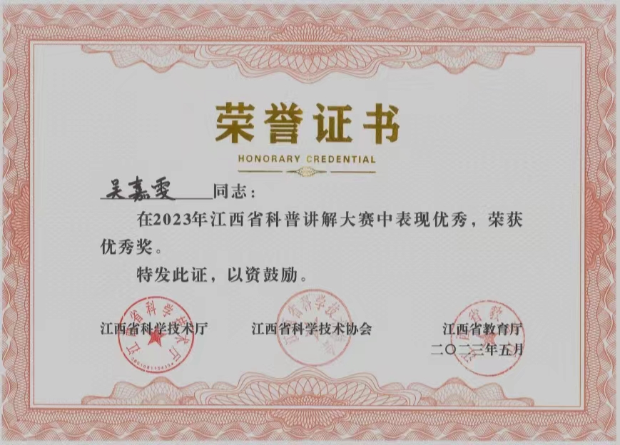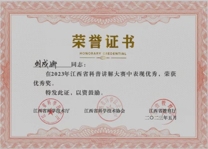 近日,由江西省科学技术厅、江西省科学技术协会、江西省教育厅主办的“2023年江西省科普讲解大赛”在江西省科技馆成功举行。贝博官网文学院推荐的四名选手全部获奖,其中,胡萌同学闯进总决赛、荣获二等奖,邱怡菲同学获得三等奖,她们还同时被授予“江西省优秀科普使者”荣誉称号,刘成娜、吴嘉雯同学获得优秀奖。