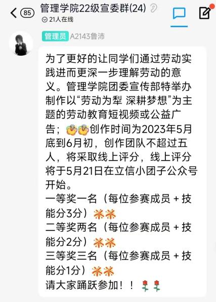 为加强学生的劳动观念,全面推进素质教育,引导广大学生崇尚劳动、热爱劳动,管理学院开展了以“劳动为犁,深耕梦想”为主题的劳动教育视频征集大赛,同学们结合学校劳动主题教育活动,围绕学习、生活、社会实践、志愿服务等方面,积极创作劳动相关视频作品,进一步激发了大家“崇尚劳动、热爱劳动”情怀。