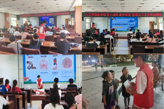 在柴桑区沙河街道新时代文明实践所,志愿者们通过PPT的形式为社区居民开展了应急救助知识、公共卫生健康知识等健康宣讲,并现场演绎了心肺复苏、海姆利克急救法。大家还深入社区和附近广场,通过近距离聊天的形式为居民们讲解宣传单内容,帮助居民深入了解公共卫生健康及疾病预防相关知识。活动将文明健康和志愿服务有机结合,不仅锻炼医学生的医学技能,培养志愿服务精神,还提高了居民的健康意识,为文明城市的建设保驾护航。