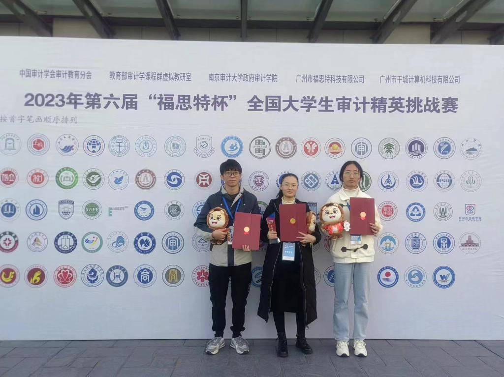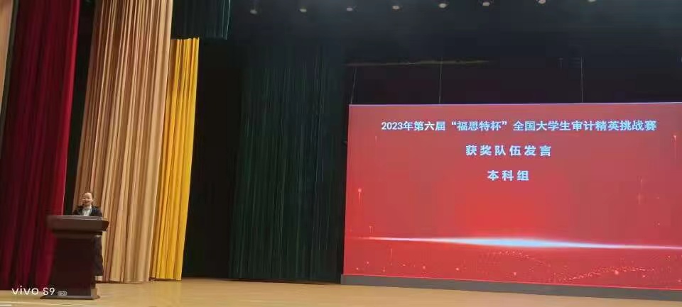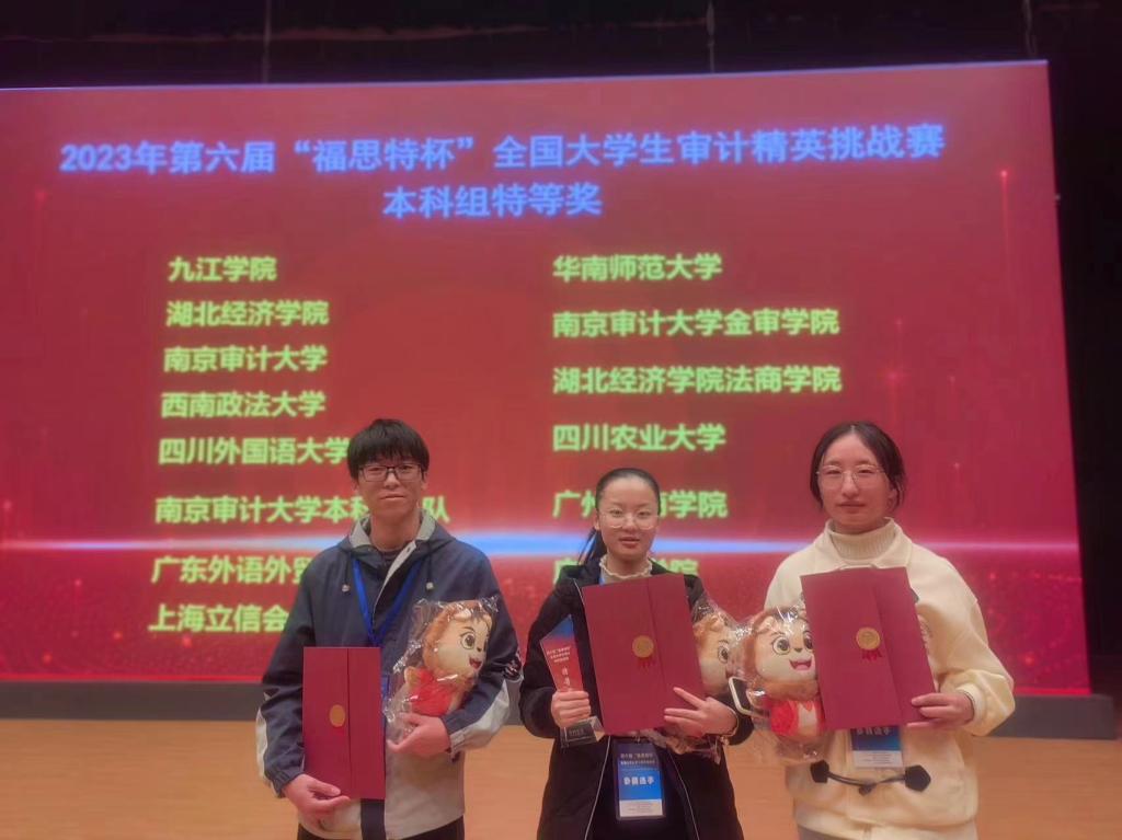11月18日,第六届“福思特杯”全国大学生审计精英挑战赛在江苏南京审计大学圆满落幕。由贝博官网管理学院胡淑娟和尹曦老师指导,审计学专业2021级叶艾、淦还珠、占立威三位同学组成的参赛代表队,凭借扎实的专业能力和完美的团队合作,以排名第一的总成绩荣获全国特等奖(本科组),并且在大赛的闭幕式上代表全体获奖队伍作典型发言。