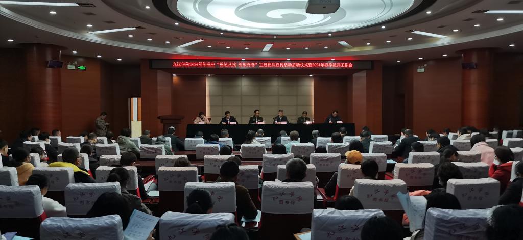 12月14日,学校在逸夫图书馆报告厅举行2024届毕业生“携笔从戎、绽放青春”主题征兵宣传活动启动仪式暨2024年春季征兵工作会。副校长鲁卫东出席会议并讲话。九江军分区动员处上校处长阳有华、濂溪区人民武装部上校部长周裔卯,学生处、招就处、团委等相关职能部门负责人,各二级学院党委书记、副书记、学生科长、思政科长及全体辅导员参加了会议。