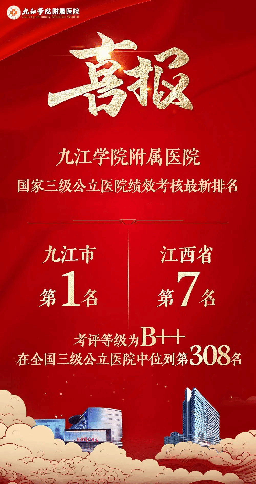 1月8日,国家卫生健康委公布了2022年度全国三级公立医院绩效考核成绩单,BB贝博艾弗森官方网站附属医院再创佳绩,考评等级为B++,在全国1415家三级综合公立医院中位列第308名,在江西省排名第七,九江市排名第一。