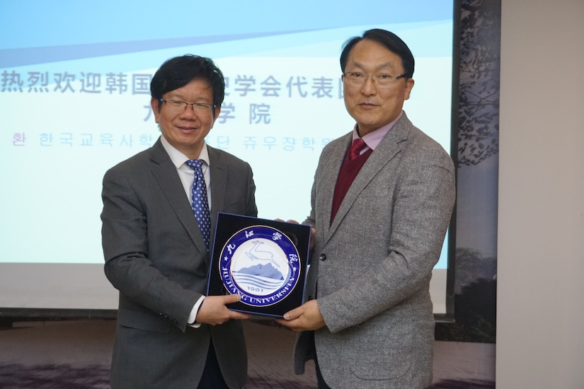 王万山对韩国教育史学会代表团的来访表示欢迎,并对学校的历史文化、发展情况、办学特色以及庐山白鹿洞研究等方面的探索与成绩等方面进行了介绍,希望今后能与韩国教育史学会开展交流与合作,为双方的发展做贡献。