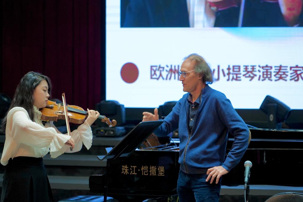 大师课期间,艺术学院三名学生进行现场演奏,菲利普先生对学生的演奏进行指导。他从音色、节奏、揉弦技巧、跳弓技巧、情感表达等方面进行了详细讲解与示范,学生们被菲利普先生诙谐幽默的讲解风格和高超的小提琴演奏技巧深深吸引。整场公开课气氛活跃、生动有趣。
