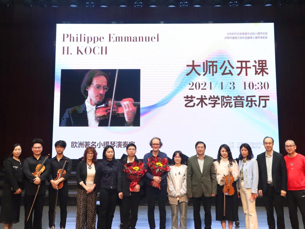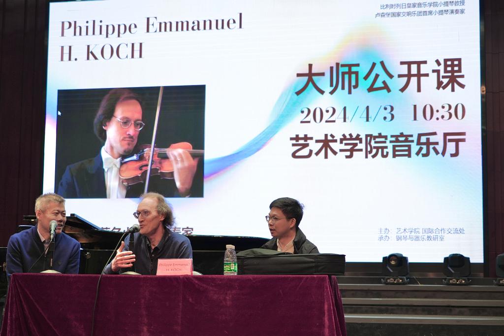 4月3日上午,由艺术学院和国际交流合作处共同举办,艺术学院钢琴与器乐教研室承办的欧洲著名小提琴演奏家菲利普·科赫先生的小提琴大师公开课在艺术学院音乐厅举行,艺术学院负责人、比利时皇家音乐学院联盟外事代表杨志军、武汉音乐学院管弦系小提琴教师文扬帆与贝博官网艺术学院师生一起参加本场活动。