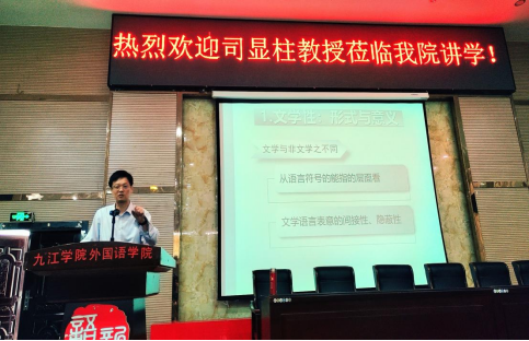 4月26日下午,为提升外国语学院师生的翻译能力和翻译素养,在江西省翻译协会四届一次理事会召开之际,外国语学院特邀北京第二外国语学院“翔宇领军学者”、博士生导师司显柱教授作了题为“文学语言与文学翻译”的专题讲座。专题讲座在外国语学院三楼报告厅举行,外国语学院四百余名师生参加讲座。