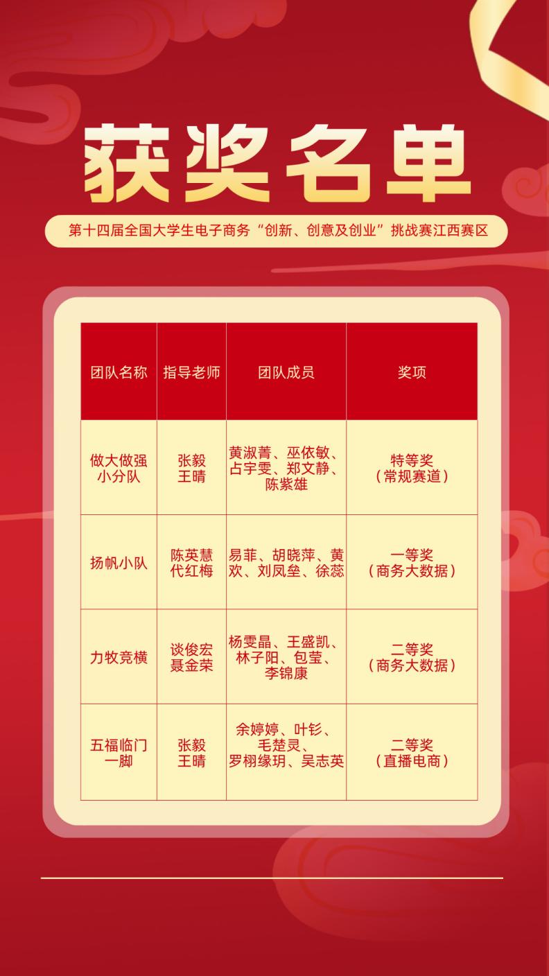 参赛团队“扬帆小队”、“力牧竞横”分获商务大数据分析赛道一、二等奖;“五福临门一脚队”荣获直播电商赛道二等奖,指导老师陈英慧、代红梅荣获江西省选拔赛“优秀指导老师”称号。