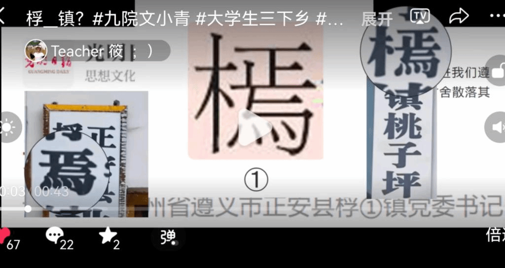 其中推普视频作品“桴 镇?”介绍了乡镇名称桴㯊(hén)镇,当地百姓土语音桴㯊(yān)镇的有趣现象,该视频总浏览量近万。