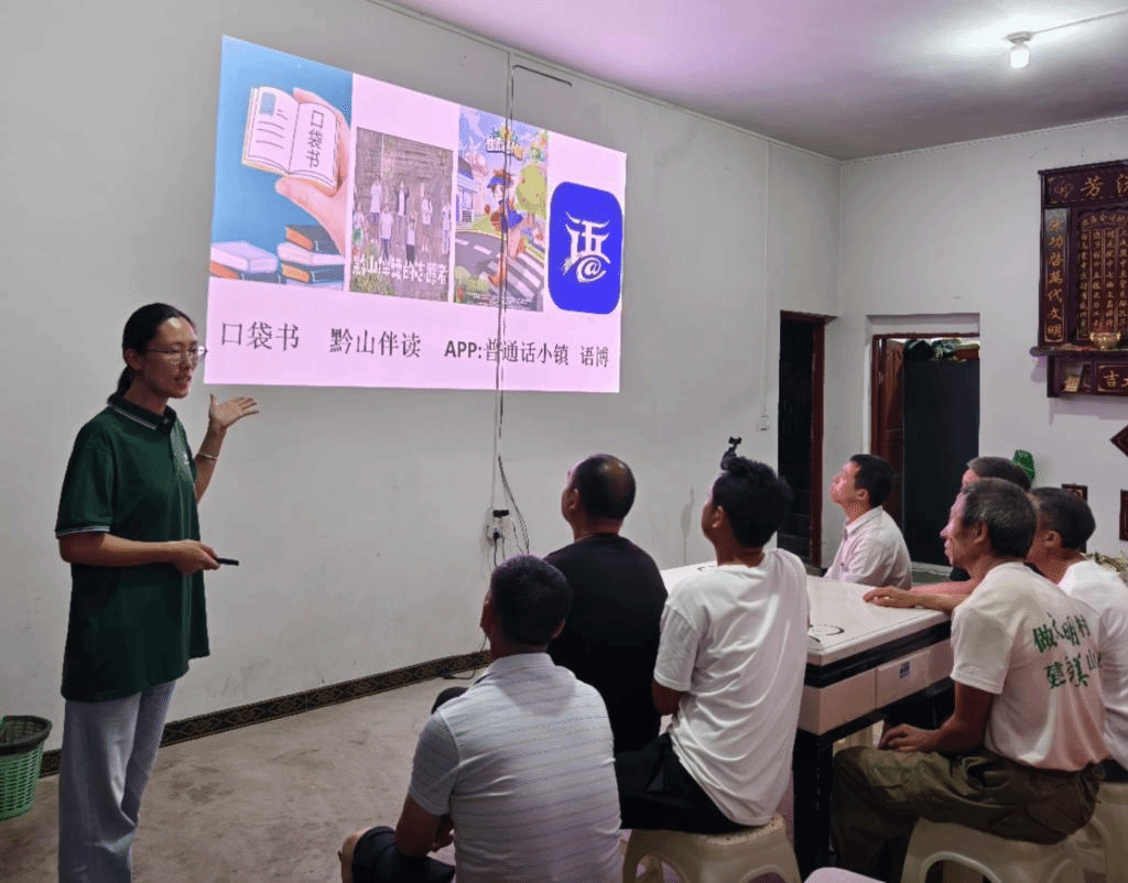 “授人以鱼不如授人以渔”,服务队在村里开起了乡村夜校。“说好普通话,圆梦你我他”,琅琅诵读声承载着大家追寻富裕生活的美好梦想。带队老师陈筱云向村干部、从事民宿和农产品销售的村民们详细介绍了“普通话”口袋书、“黔山伴读”志愿服务和“普通话小镇”、“语博”等学习APP。“学普通话有什么难的,这么简单!”桃子坪村的陈友书记笑着鼓励着全体学员。
