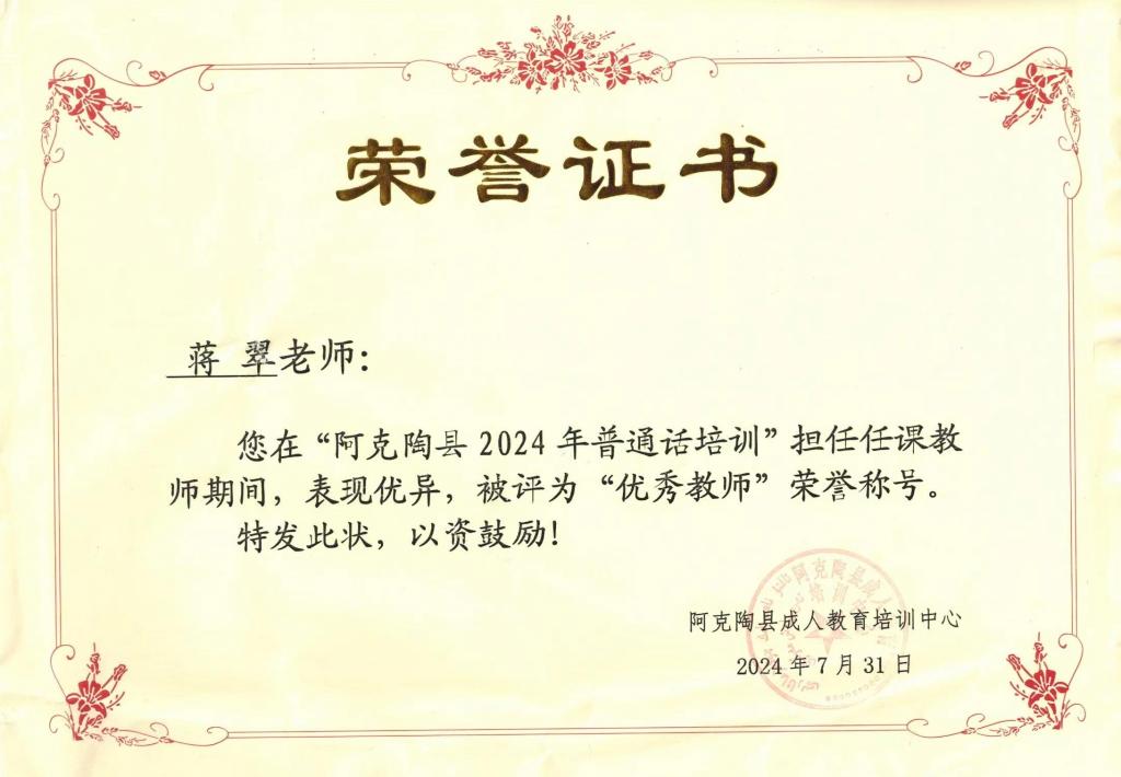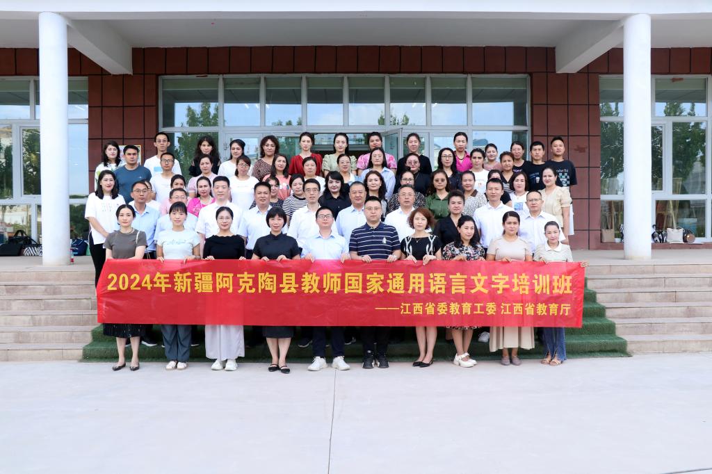 为加大国家通用语言文字推广力度,提高民族地区、农村地区教师国家通用语言文字应用能力和教学水平,认真落实《江西省教育厅 新疆克州人民政府合作协议》《江西省对口援疆项目实施方案》,7月初,江西省委教育工委、省教育厅选派6名语言文字专业教师赴新疆克州阿克陶县开展援疆支教活动。学校积极响应上级工作要求,经国家语言文字推广基地(BB贝博艾弗森官方网站)遴选推荐,教务处蒋翠老师成功入选此次援疆支教工作团,并赴新疆阿克陶县对300余名参训教师学员开展为期20天的集中培训。
