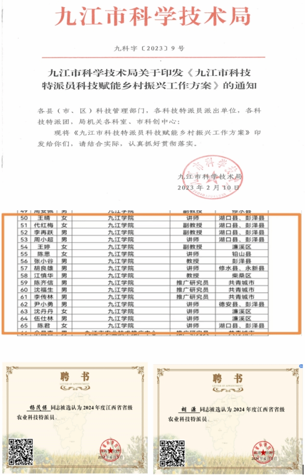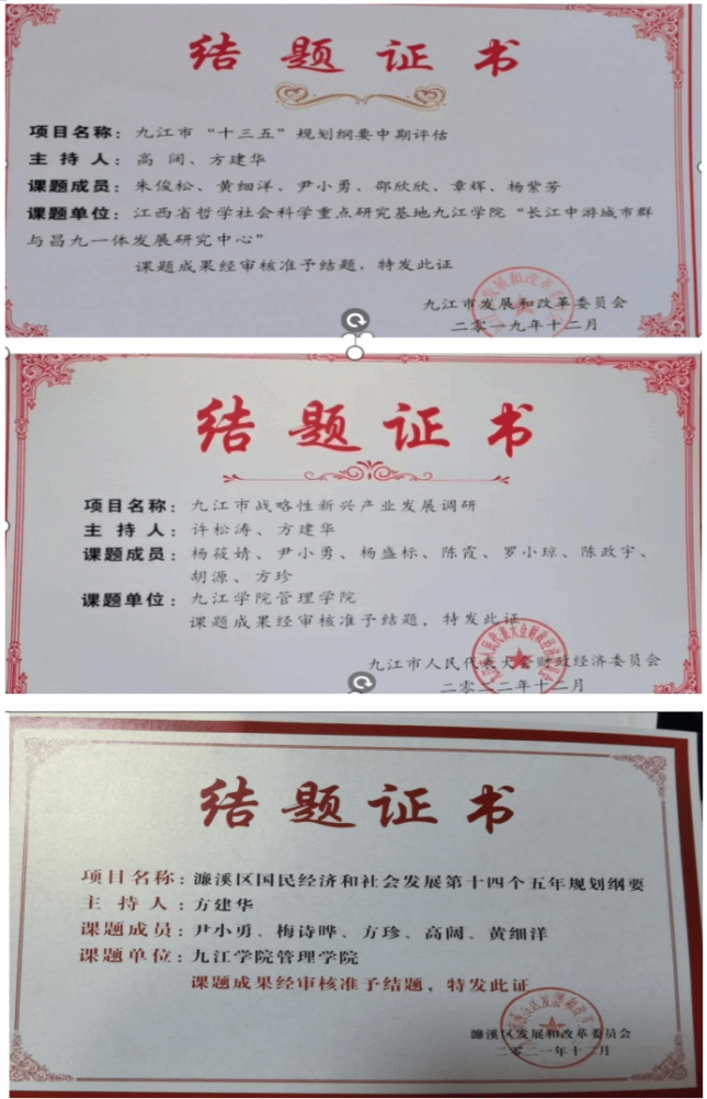 学院充分利用人才聚集优势,发挥专业所长,主动对接地方政府及企业,积极服务地方经济建设和发展。与乡村振兴帮扶点武宁双新村、市人大经贸委、庐山市等签订战略合作协议,积极选派优秀青年博士到武宁西海管委会、九江市投融资担保公司等挂职,先后为九江市人民政府办公室、九江市人民代表大会常务委员会办公室、九江市发展和改革委员会、九江市人大财经委、九江市机关事务局、九江市商务局、九江市发改委、濂溪区发改委等政府部门提供研究报告,研究成果得到相关部门采纳。先后遴选推荐科技特派员9人,已经为瑞昌、湖口、彭泽、九江经开区、柴桑区、横塘镇等地提供了帮扶服务,帮助政府部门申报江西省创业孵化示范基地,成功立项“德安县电子商务创业孵化示范基地”,帮助九江前沿网络科技有限公司获得2023年度市级科技企业孵化器认定。近三年立项政校、校企合作横向课题累计达49项,到账经费1053万。
