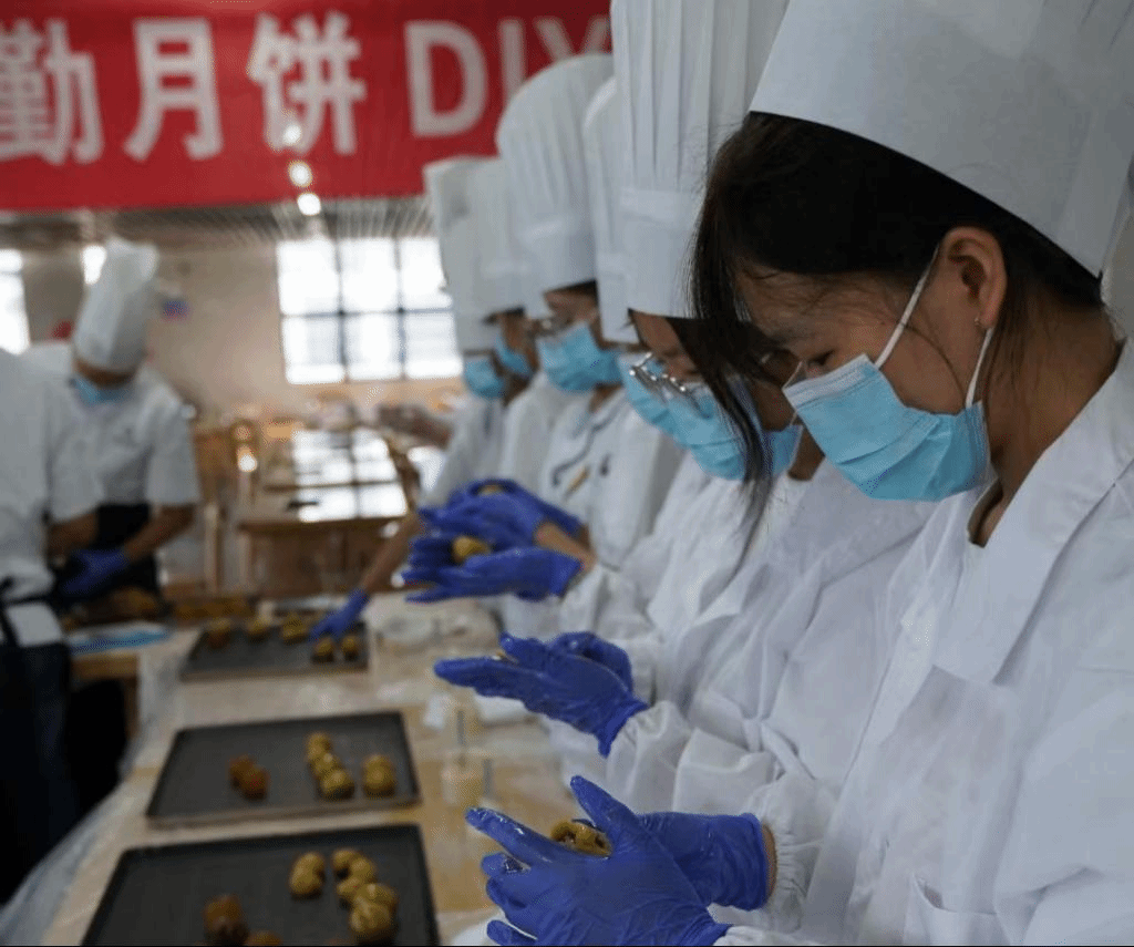 此外,活动还特别设置了学生DIY制作月饼的环节。在紫薇园学生二食堂大厅内,20余名学生在专业糕点师的指导下,亲手制作属于自己的月饼。他们一边制作,一边交流着中秋的故事和传统文化,现场气氛热烈而温馨。通过DIY制作月饼,学生们不仅体验到了传统工艺的魅力,还增进了彼此之间的友谊,丰富了校园文化生活。