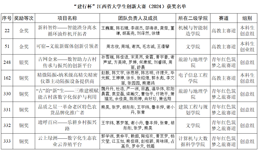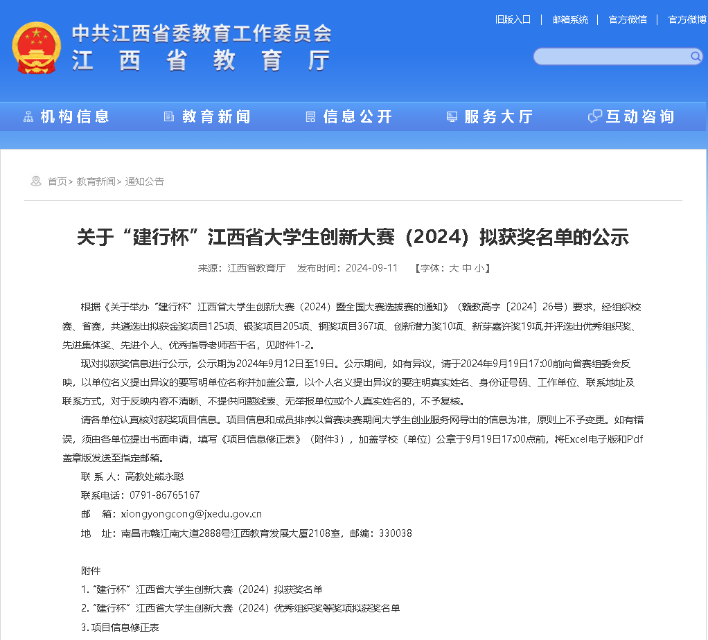 近日,“建行杯”江西省大学生创新大赛(2024)暨全国大赛选拔赛获奖名单全部揭晓。贝博官网师生在本项大赛中取得较大的历史性突破,首次突破省赛金奖,获奖层次和数量均有较大程度的提升,获省赛金奖2项、银奖1项和铜奖5项的团体佳绩,其中2个金奖项目推荐进入全国总决赛。