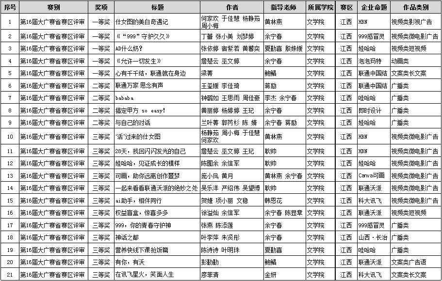 本届大广赛获奖取得了显著突破。首先,省赛区获奖率比以往有显著提升。今年,在学院实践育人理念的倡导下,学院共有10余位老师参与了学生参赛团队的指导工作,学生参赛热情分外高涨,营造了良好的大赛氛围。最终,有9位老师指导的21件学生参赛作品获得省赛区等级奖。