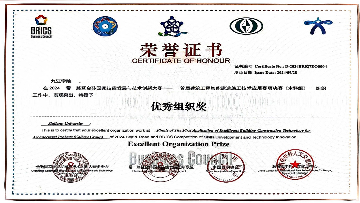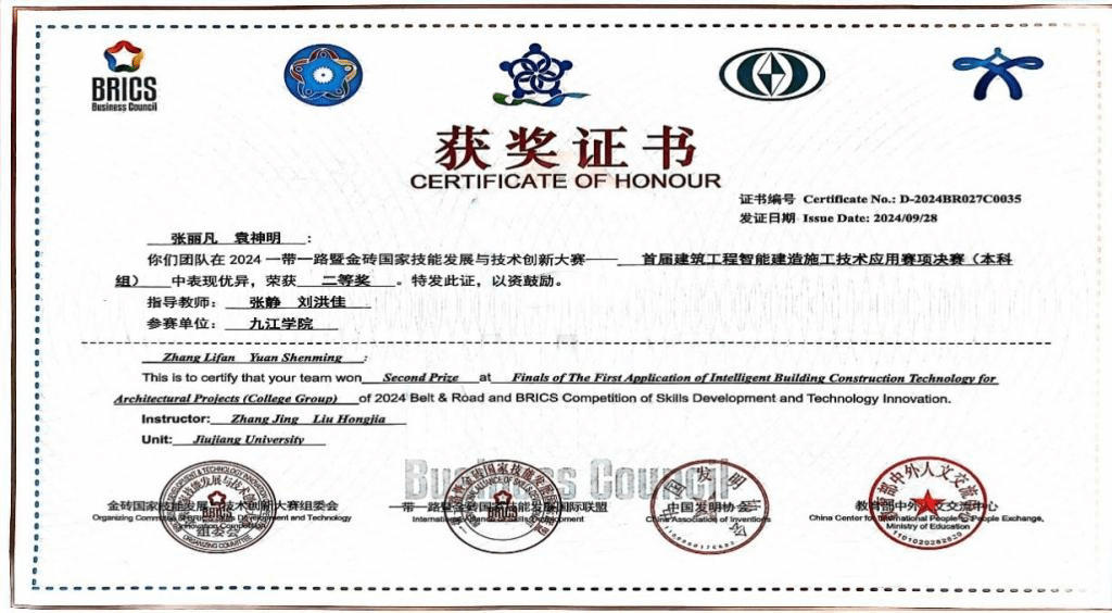 近日,2024一带一路暨金砖国家技能发展与技术创新大赛首届建筑工程智能建造施工技术应用赛项全国总决赛在杭州圆满落幕。本届智能建造赛项决赛经过前期覆盖全国600余所高校的校园赛及区域选拔赛,最终415支队伍入围总决赛。贝博官网建工学院张丽凡,袁神明两位同学参加此次比赛,经过激烈比拼,最终荣获本科组二等奖;贝博官网获得“优秀组织奖”,指导教师张静、刘洪佳获“优秀指导教师”荣誉称号。